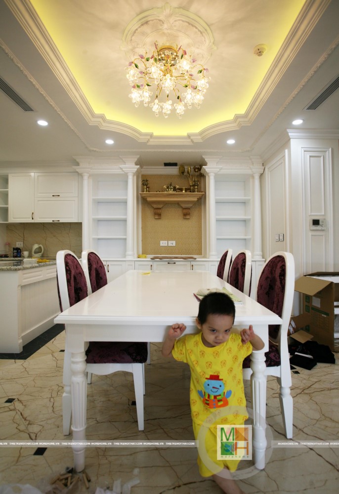 Một lần nữa, màu trắng là chủ đạo cùng màu tím sẫm trong phòng khách lại được lặp lại trong phòng ăn. Tủ bếp, bàn ăn màu trắng với ghế ngồi nền trắng đệm tím sẫm, nền nhà màu vàng nhạt... tạo vẻ sang trọng đến bất ngờ cho không gian này. Đặc biệt, hệ thống đèn chùm trên trần nhà được thiết kế rất độc đáo khiến bạn không thể rời mắt khi ngắm nhìn nó.