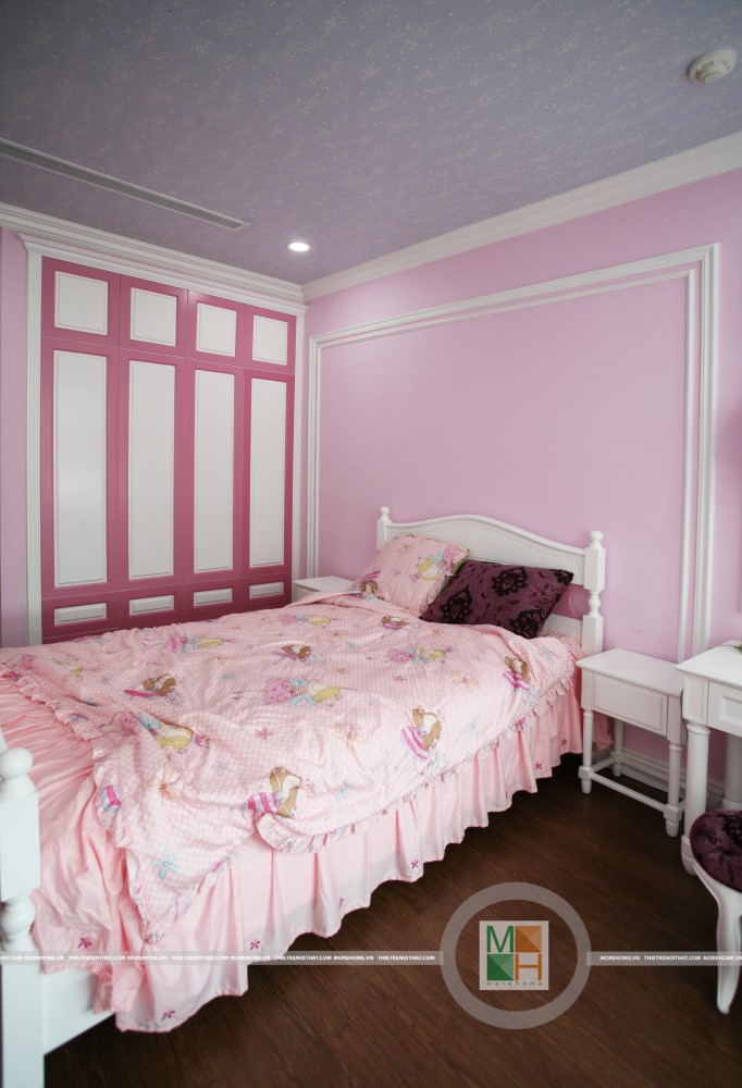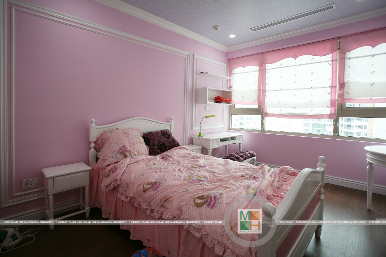 Phòng ngủ dành cho bố mẹ nổi bật là chiếc giường được thiết kế họa tiết cầu kì với đầu giường cong uốn lượn trên nền trắng nổi bật của không gian. Kết hợp với đó là chiếc rèm và ghế ngồi màu vàng và chanh tạo nên sự sang trọng cuốn hút đến bất ngờ khiến bạn khi bước vào đây có cảm giác như bước vào thế giới thần tiên. Phòng ngủ của bé chủ yếu là tông màu hồng lãng mạn cùng chiếc giường màu trắng được thiết kế đơn giản, chiếc bàn học, giá sách... màu trắng nhẹ nhàng.