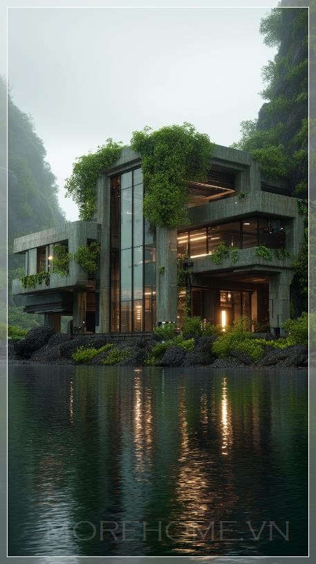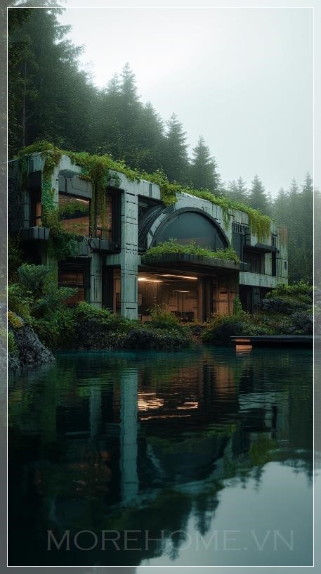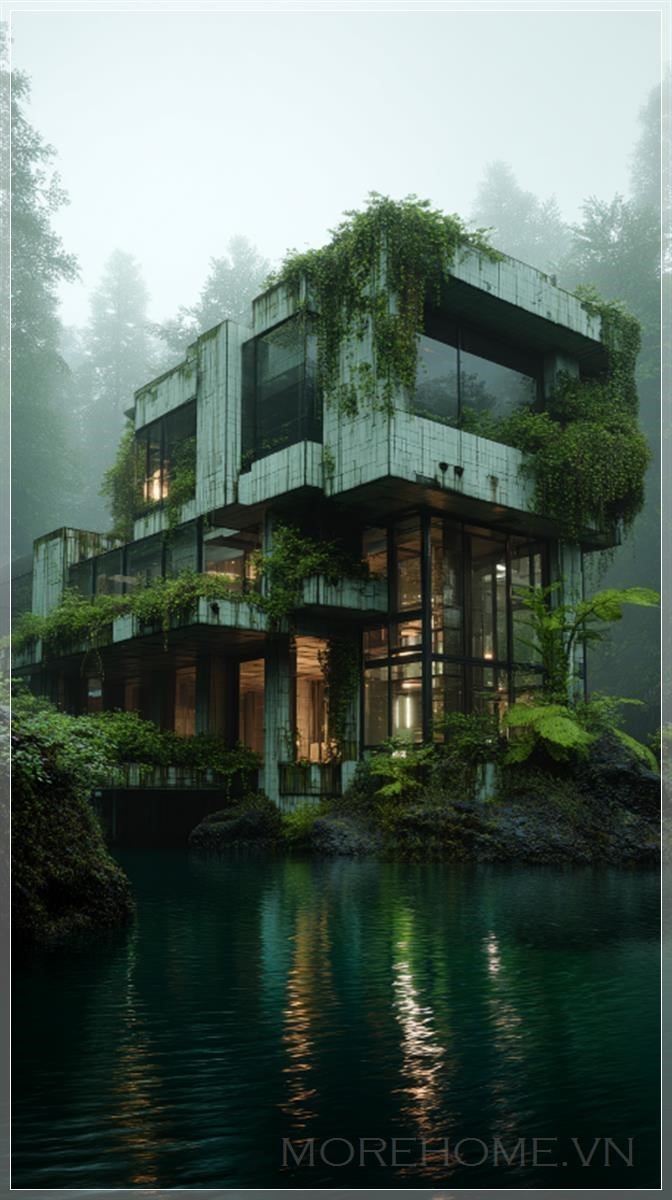 Bề ngoài của căn biệt thự mang đậm dấu ấn của sự hòa hợp giữa thiên nhiên và kỹ thuật, với mái nhà bằng gỗ cổ điển nhưng lại được trang bị những tấm năng lượng mặt trời hiện đại. Những bức tường của biệt thự được phủ một lớp vỏ ngoài từ vật liệu sinh học, thân thiện với môi trường, nhưng vẫn toát lên sự sang trọng và tinh tế của một không gian sống đương đại. Những khóm cây xanh tươi tốt mọc lên từ các khe nứt trên bức tường, tạo thành những mảng cây xanh rực rỡ trong khi vẫn giữ được tính năng của một công trình cao cấp.