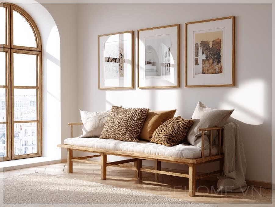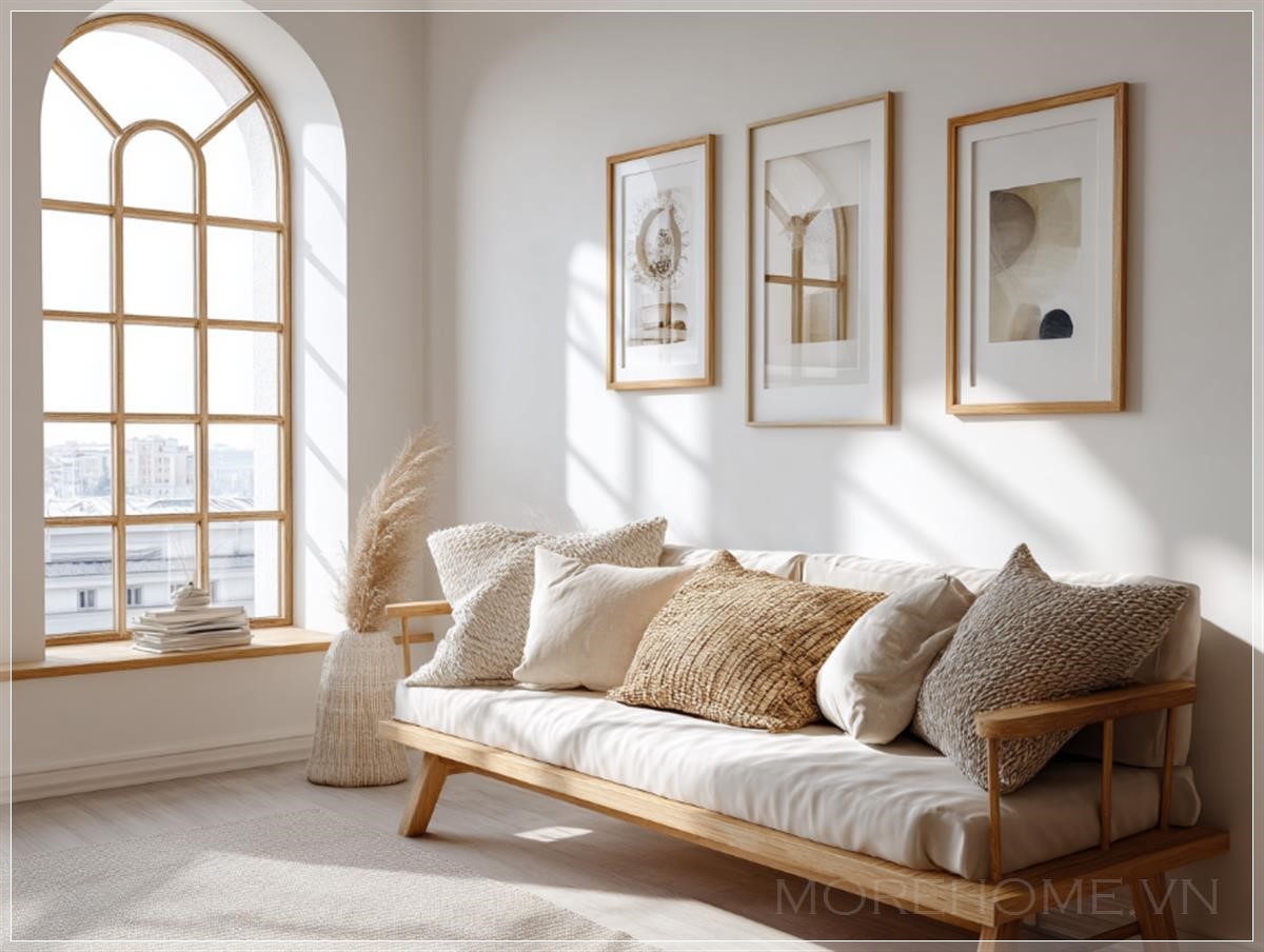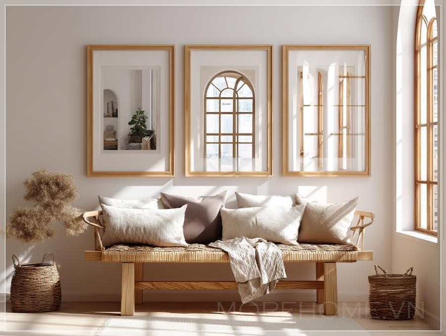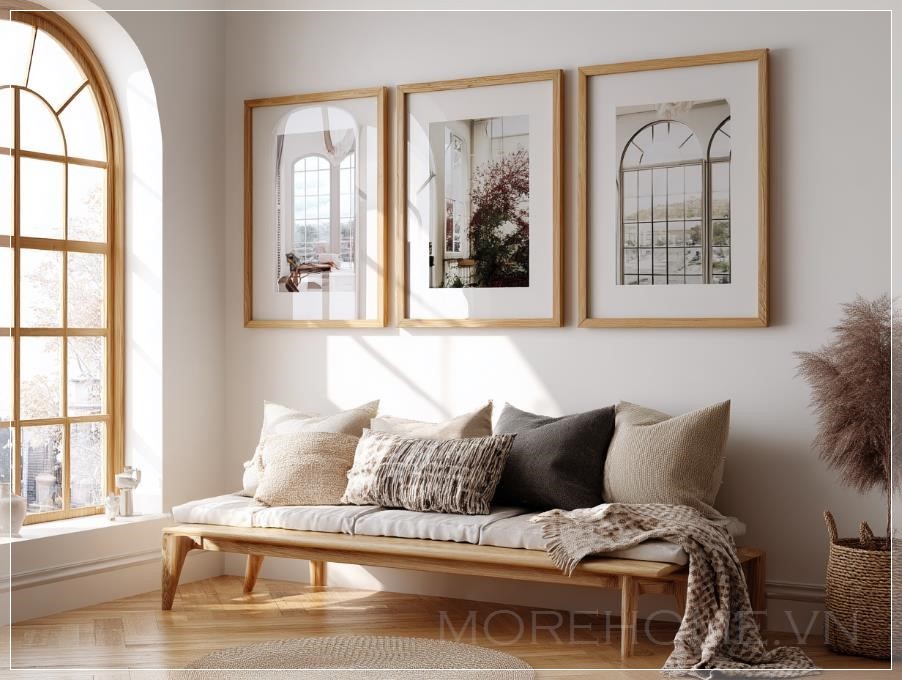 Ánh sáng tự nhiên nhẹ nhàng tràn ngập căn phòng, tạo nên những đường nét mềm mại và ấm áp trên bức tường trắng tinh khôi. Ba khung tranh gỗ lớn được treo cân đối, như những cánh cửa sổ dẫn đến thế giới nghệ thuật, chờ đợi để được lấp đầy bởi những tác phẩm yêu thích của gia chủ. Đây chính là tinh thần của phong cách Scandinavian - sự kết hợp hoàn hảo giữa chức năng và thẩm mỹ, giữa sự đơn giản và tinh tế.