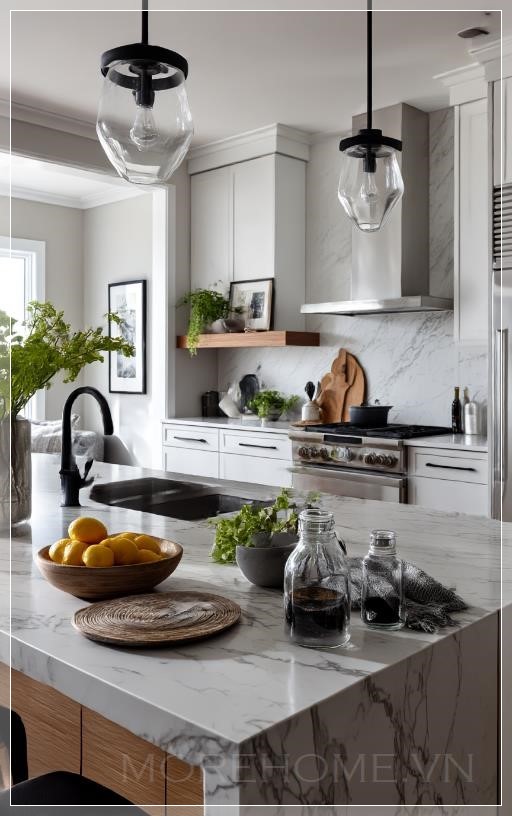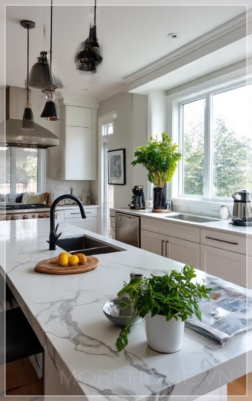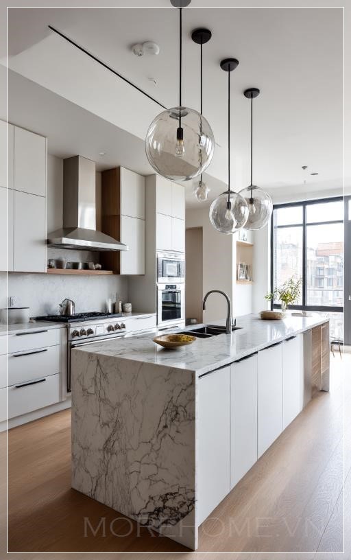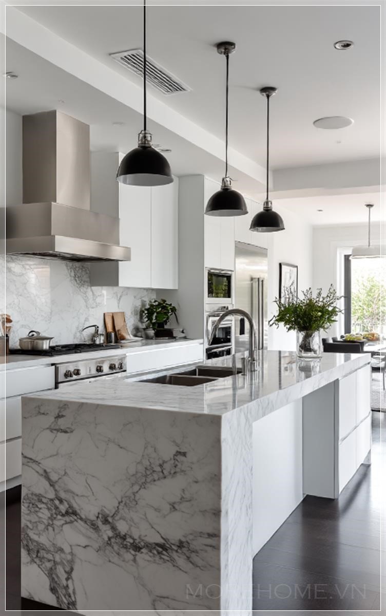 Ánh sáng tự nhiên tràn ngập không gian, phản chiếu trên bề mặt đá cẩm thạch trắng tinh khôi của đảo bếp trung tâm. Đây không chỉ là một món đồ nội thất, mà còn là tâm điểm của cả không gian - một khối kiến trúc độc lập với những đường vân tự nhiên quyến rũ chạy dọc theo bề mặt, kể câu chuyện riêng của từng viên đá được chọn lọc kỹ càng.