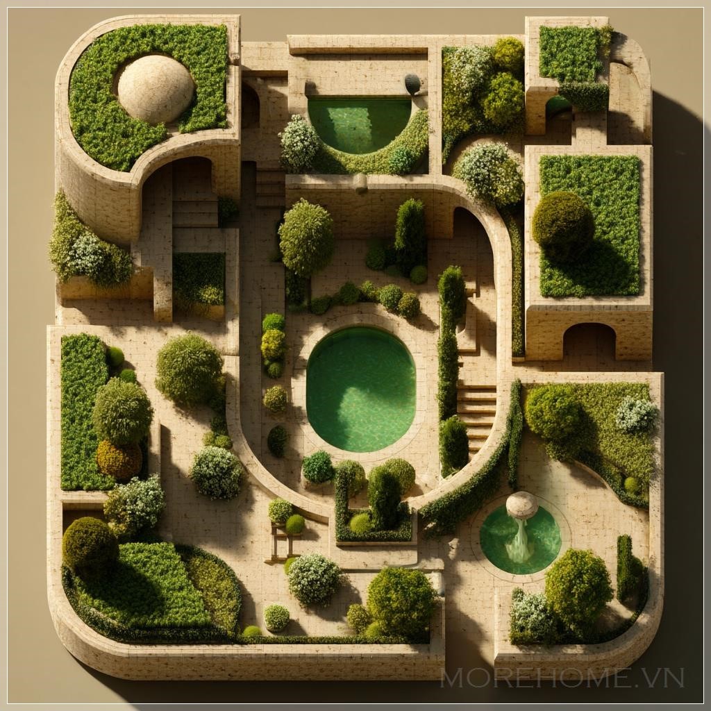 Triết lý thiết kế này bắt nguồn từ khái niệm "Chahar Bagh" - bốn khu vườn, một nguyên tắc cổ xưa của người Ba Tư trong việc chia không gian thành các phần đối xứng, tạo nên sự cân bằng hoàn hảo. Sân trong được chia thành bốn khu vực bởi những lối đi lát đá tự nhiên, mỗi góc là một thế giới nhỏ với những loài cây cảnh được chọn lọc kỹ lưỡng, từ những cây hồng cổ điển đến những bụi thảo mộc thơm ngát.