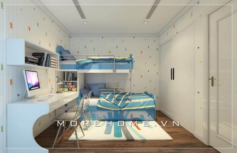 Tủ quần áo trẻ em có thiết kế hiện đại, âm tường kịch trần cửa lùa bằng gỗ công nghiệp, giúp bé có thể lưu trữ đồ mặt mà không chiếm nhiều không gian trong phòng.