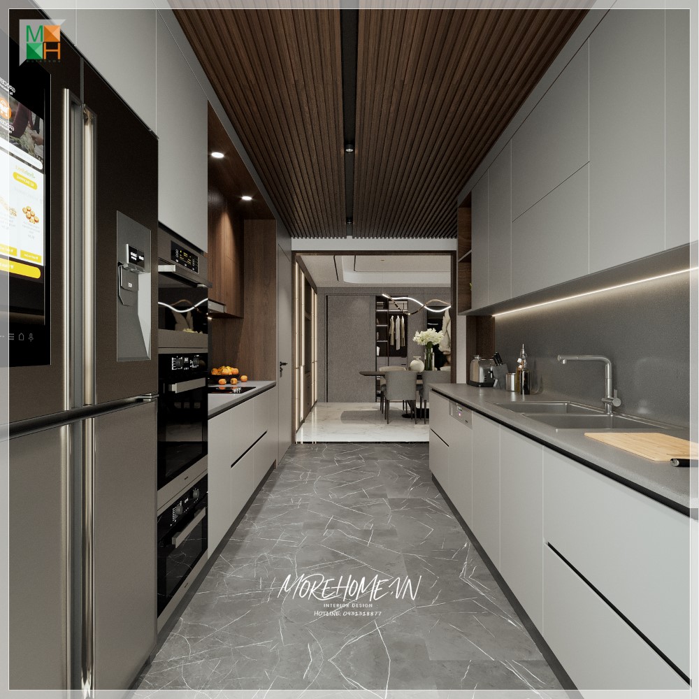 Tủ bếp song song gỗ công nghiệp mặt đá hiện đại có thể tối ưu hóa diện tích không gian, cung cấp sự thoải mái và tiện lợi cho người sử dụng.